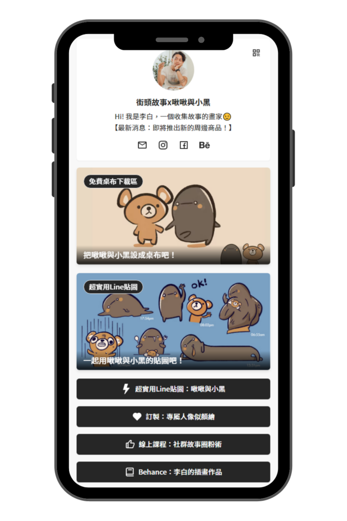 首先看到最上方的「個人檔案」區塊,他置入了四個社群 icon,美觀又一目瞭然,從不同平台前來的粉絲,能清楚知道街頭故事目前經營了哪些社群。