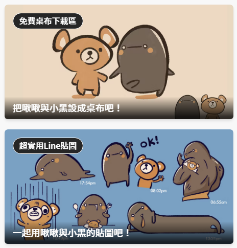 接著是兩個「橫幅看板」,運用醒目且具代表性的圖片,為其作品特色及畫風定調,讓人馬上就能辨識且記住其創作風格。這裡還規劃了「免費桌布下載區」,不僅能吸引粉絲前來下載免費桌布,讓傳送門的流量暢旺,更是回饋粉絲的一件禮物與心意。