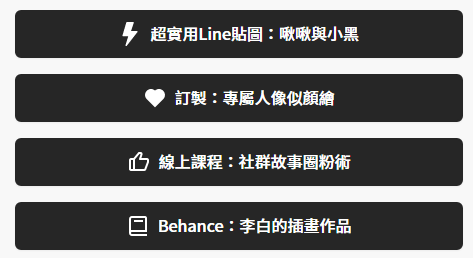 再來透過四個清晰的「文字按鈕」,提供目標明確的訪客,一處能快速瀏覽的捷徑。雖然部分連結與個人檔案的 icon 重覆,但這邊透過簡潔的文字描述與清楚可愛的 icon,讓按鈕連結的社群輪廓與用途更加清楚。