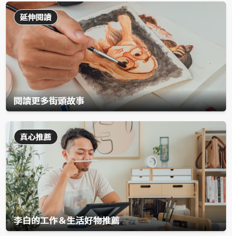 將其主要的服務與作品都介紹完後,再運用兩塊橫幅看板,分別規劃為「延伸閱讀」及「真心推薦」,作為深度資訊介紹的入口。主要目的是讓粉絲與想進行合作的業者,能更加了解街頭故事。