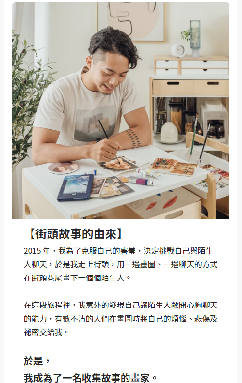 這頁透過圖片、文字,將較為複雜的緣由故事、經歷等資訊清楚呈現。更運用自訂分頁的文字編輯器,設定不同的字級及字型變化,讓閱讀更加舒適。