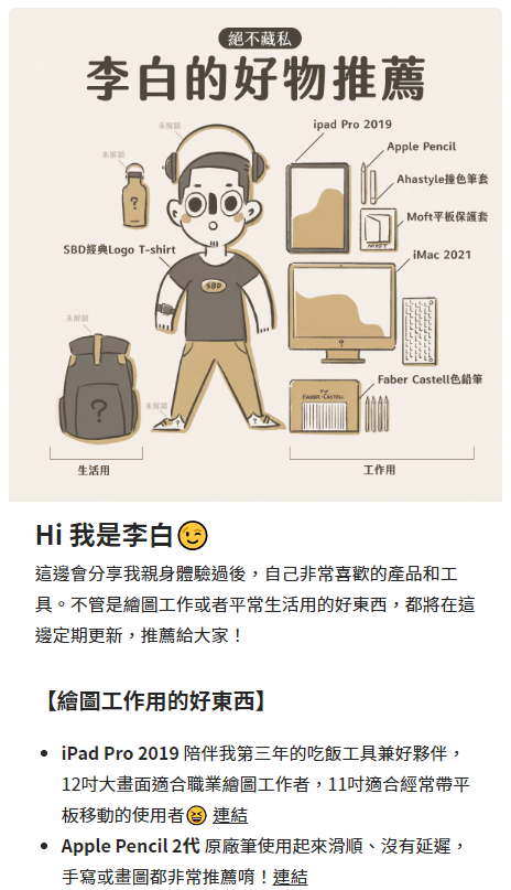 李白為這頁繪製了一張可愛的首圖,介紹其創作所使用的各種工具。圖片下方將這些工具進行簡單介紹,並放上產品頁的超連結。不僅能加深粉絲對其個人了解與認同感,亦是一種與廠商合作的新穎模式。