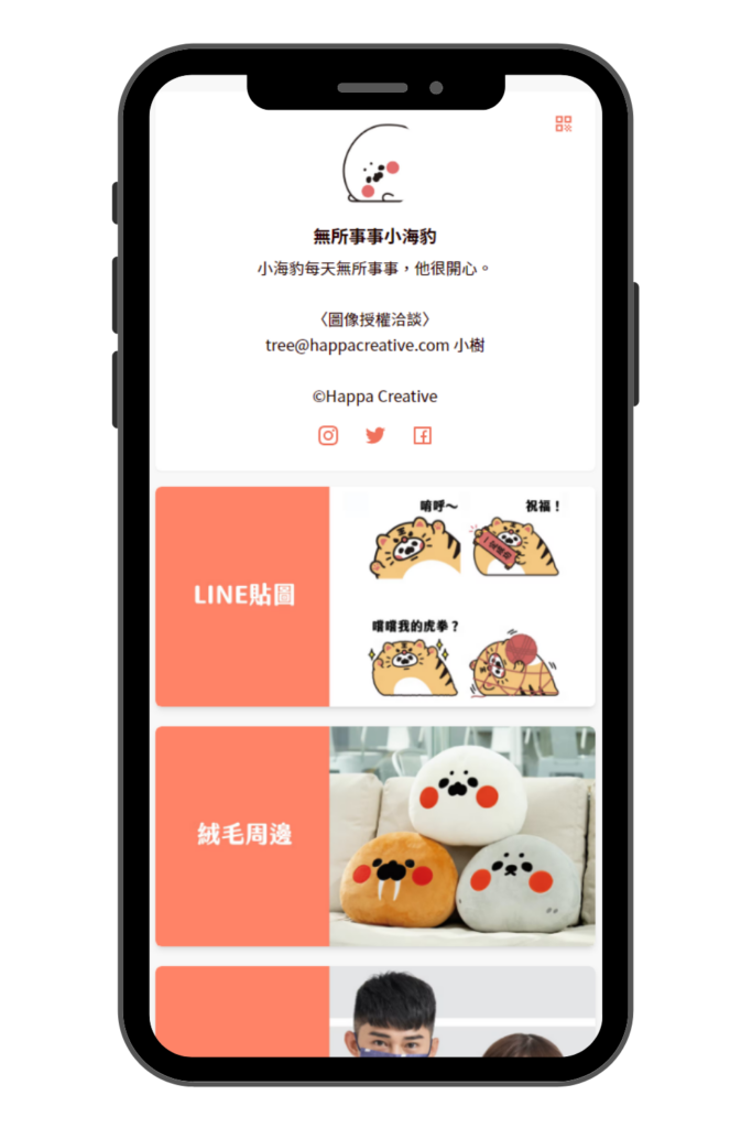 小海豹的傳送門頁面相當極簡,以白色為基底,透過三塊規格一致的「橫幅看板」,將Line貼圖、周邊商品等連結收整。整體在視覺上相當清爽舒適,也彰顯出「可以簡單誰想要複雜」的小海豹精神。