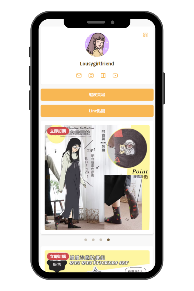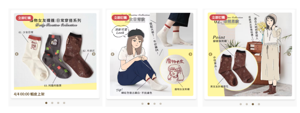 廢物女友的傳送門主要用來推廣其設計商品。頁面透過兩個「方形看板」,並運用「自動輪播」功能,推送當季多款主打商品,畫面上暨美觀又有質感。同時運用「貼紙文字」功能呼籲粉絲立即訂購,有效達到促購效果。